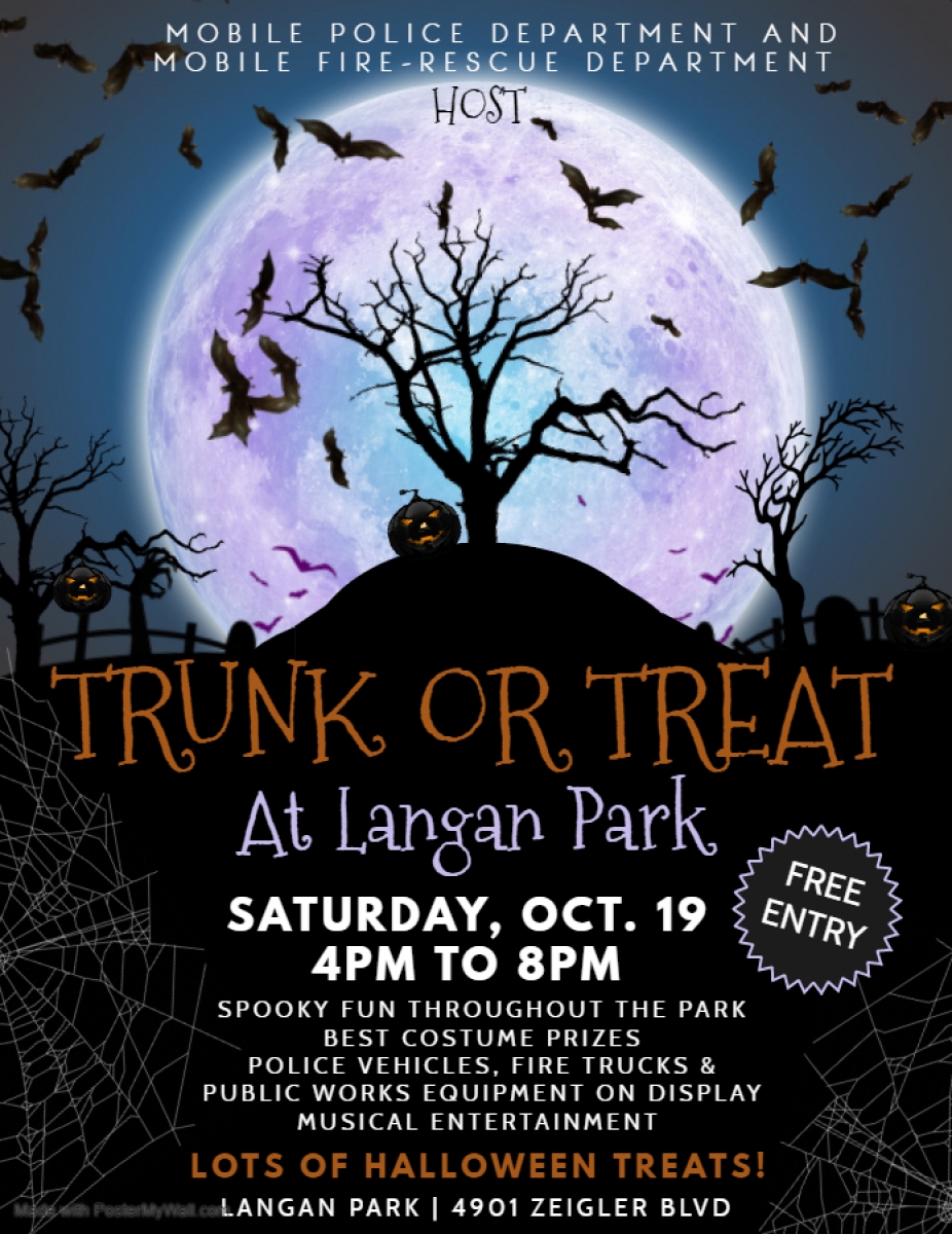 Mobile Police and Mobile Fire-Rescue, along with Public Works, join forces to present “Trunk or Treat” this Halloween. The first-time event will be held at Langan Park Saturday, Oct. 19 from 4 to 8 p.m. Trunk or Treat is a free, fun and safe Halloween experience for the entire family.