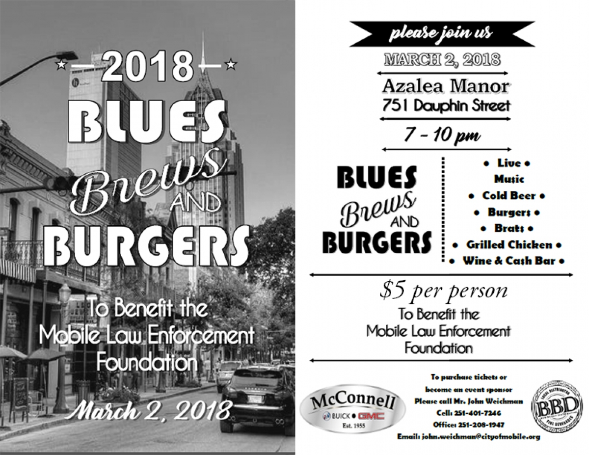 The public is invited to attend Blues, Brews and Burgers, an event hosted by the Mobile Law Enforcement Foundation. At this inaugural event, all proceeds will be donated to Officer Justin Billa’s family. Set for Friday, March 2, 2018 from 7 to 10 p.m., Blues, Brews and Burgers will be held at Azalea Manor located at 751 Dauphin Street.