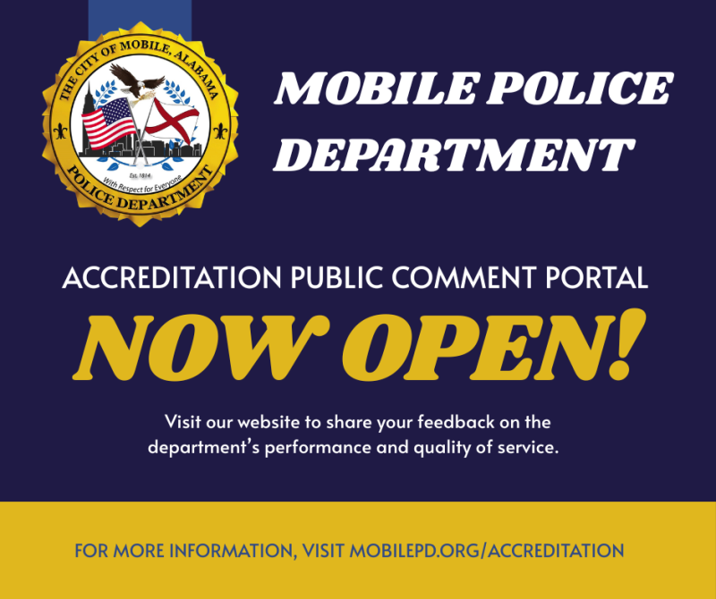 The CALEA Accreditation Public Comment Portal & Citizen Survey for the @Mobile Police Department is now open. Since 1994, the department has been accredited by the Commission on Accreditation for Law Enforcement Agencies (CALEA).