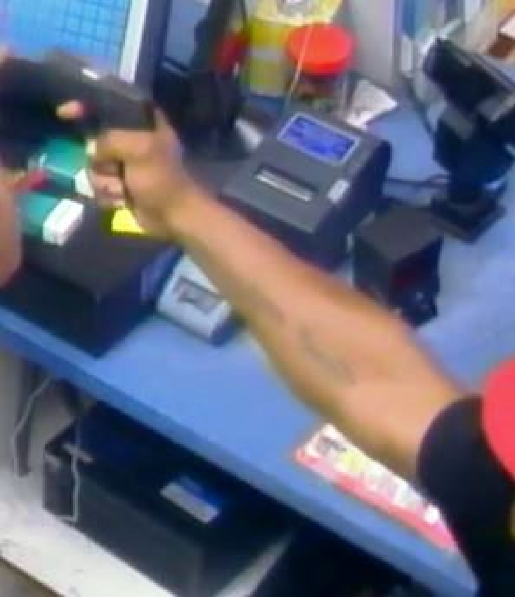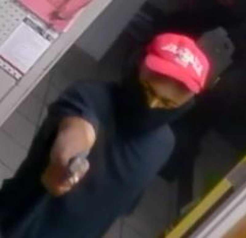 The suspect has a visible tattoo on his right forearm. He is about 5 feet 6 inches or 5 feet 7 inches tall with slender build. The suspect wore black pants, black shirt, black shoes, a red Alabama hat, and a black bandana during the robbery. Note the image that shows his eyes. He was armed with a black .380 semi-automatic pistol.