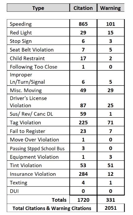 1,720 citations were issued during this two-week traffic enforcement operation, while 331 warnings were issued during the same timeframe. The largest offense was speeding.